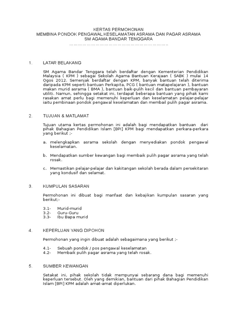 Pada kesempatan kali ini saya ingin share salah satu surat yang sangat penting untuk sekolah yaitu surat permohonan bantuan pagar untuk sekolah. PEMERINTAH KABUPATEN KATINGAN DINAS PENDIDIKAN SMP NEGERI SATU ATAP 1 KATINGAN HILIR Email. Kertas kerja cadangan ini disediakan untuk mendapat kelulusan Jawatankuasa Pentadbiran Fakulti untuk kerja-kerja baik pulih sistem siar raya bagi Dewan Seminar yang terletak di Bangunan N28a.